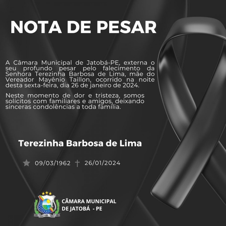A Câmara Municipal de Jatobá-PE, externa o seu profundo pesar pelo falecimento da Senhora Terezinha Barbosa de Lima, Mãe do Vereador Mayênio Taillon, ocorrido na noite desta sexta-feira, dia 26 de janeiro de 2024.