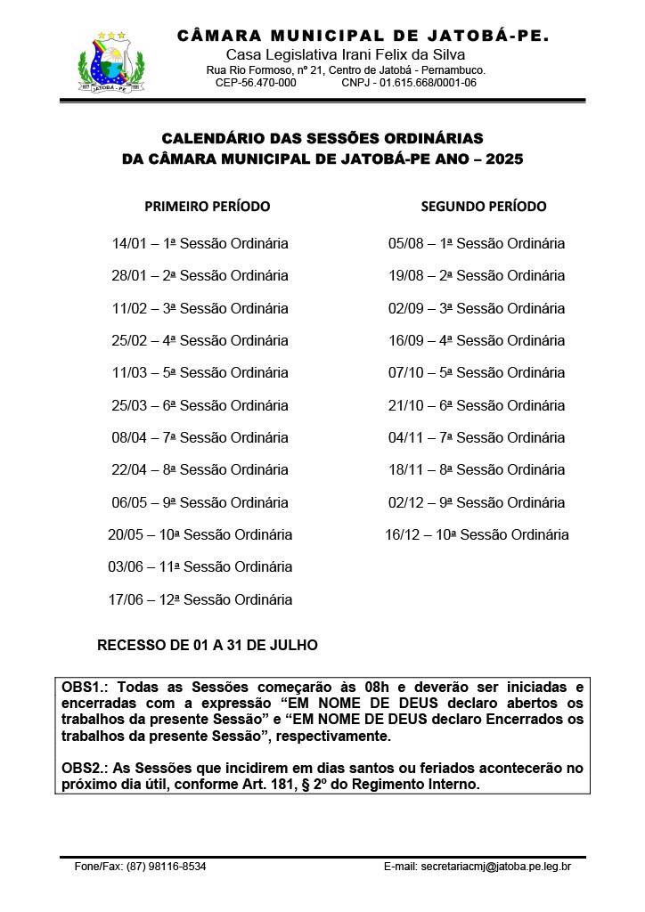 Comunicamos à sociedade Jatobaense, o Calendário das Sessões Ordinárias desta casa legislativa, no ano de 2025.